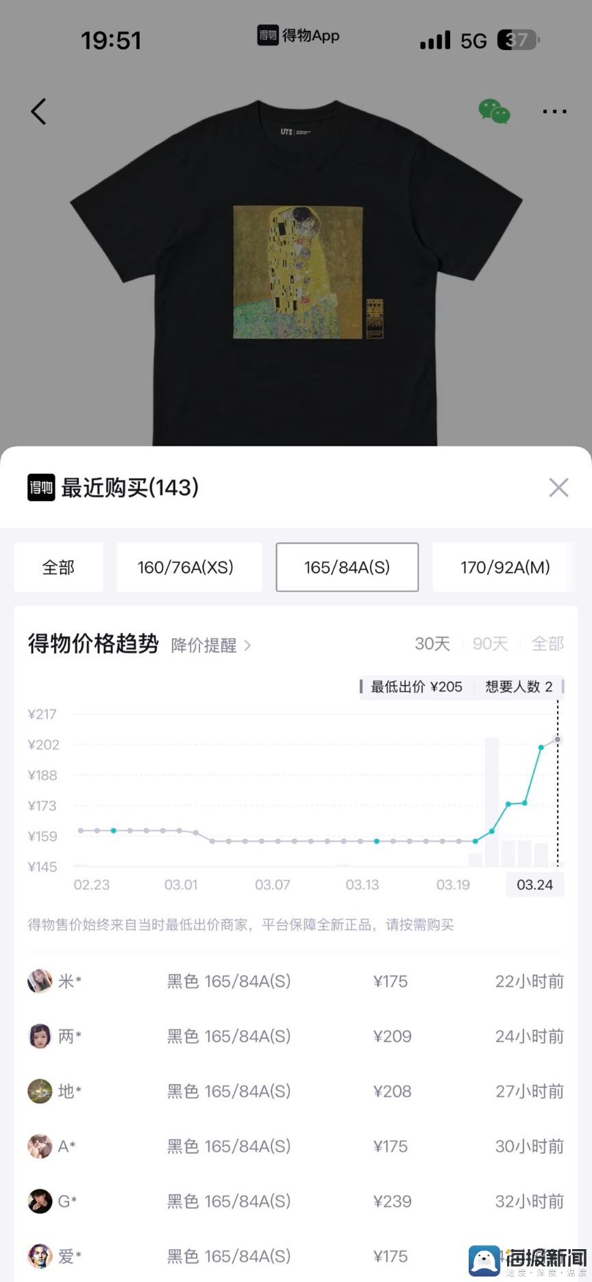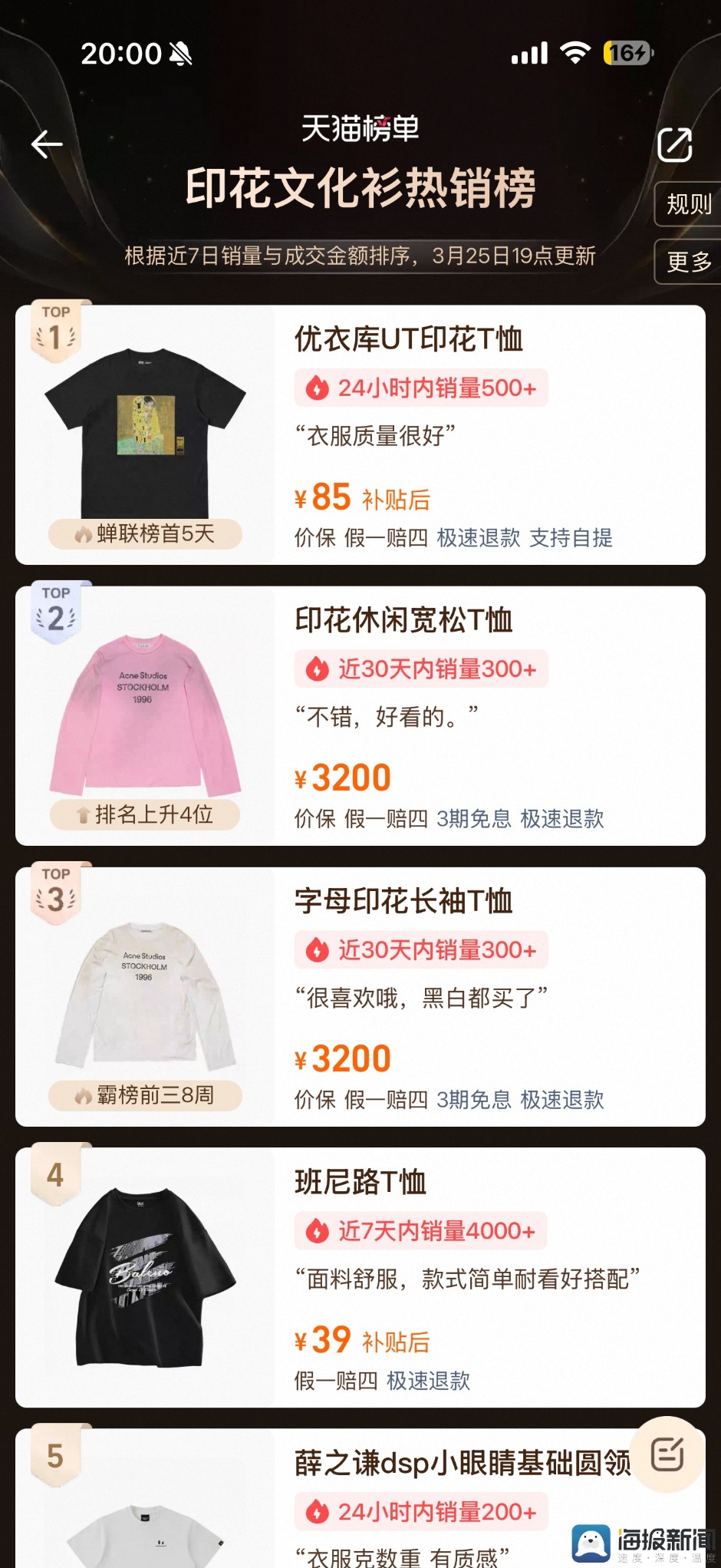 3月25日,海报新闻记者在淘宝天猫优衣库官方旗舰店看到,该T恤原价99元,优惠价格85元,近7天超6万人浏览、1万余人下单,目前仅剩L、XL码在售,小码及XL以上码数全面售罄。该T恤也迅速登上了天猫印花文化衫热销榜第一名,并已蝉联榜首5日,该榜单显示24小时内销售超500件。