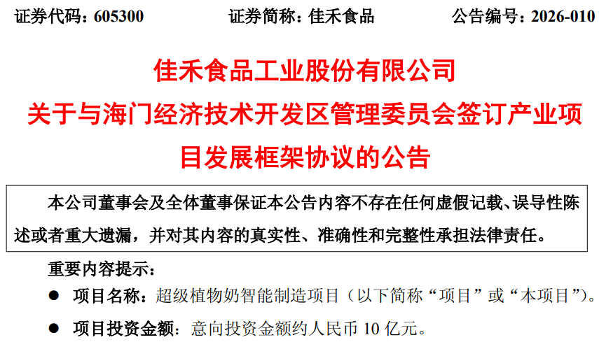 3月25日晚间,“植脂末第一股”佳禾食品(605300.SH)公布,公司与海门经济技术开发区管理委员会经友好协商,于2026年3月24日签订了《产业项目发展框架协议》,双方就投资超级植物奶智能制造项目的相关事项达成合作意向,意向投资金额约10亿元人民币,拟生产牛乳茶、燕麦奶、核桃乳等液体饮料。