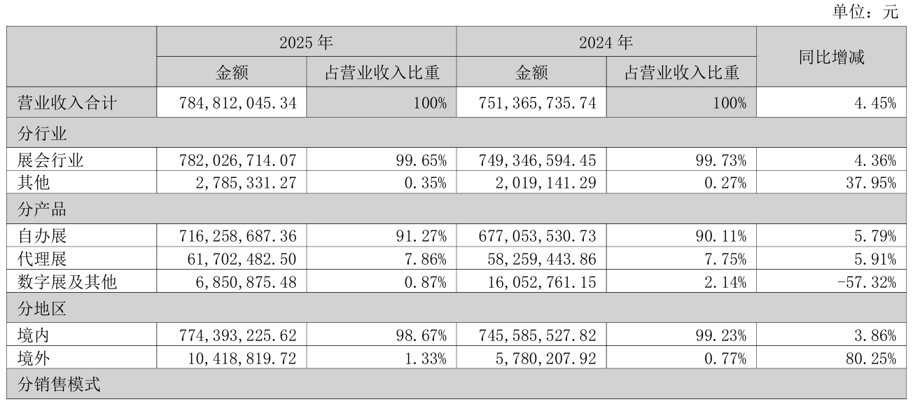 回顾2025年,米奥会展分享,受国际局势变化导致的展会项目取消影响,公司当期收入及盈利增长承受一定压力,在公司营收、盈利和能力提升不可能全部实现增长的严峻形势下,公司从长远发展角度出发弃车保帅,选择了在保证公司正常盈利和满足发展的基础上确保展会规模增长和服务能力增长为主的策略。