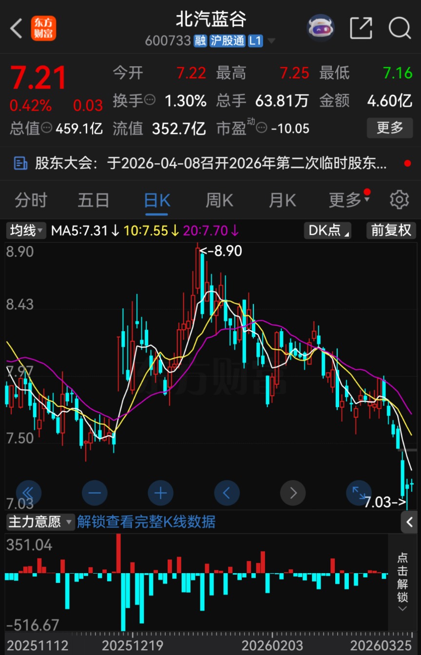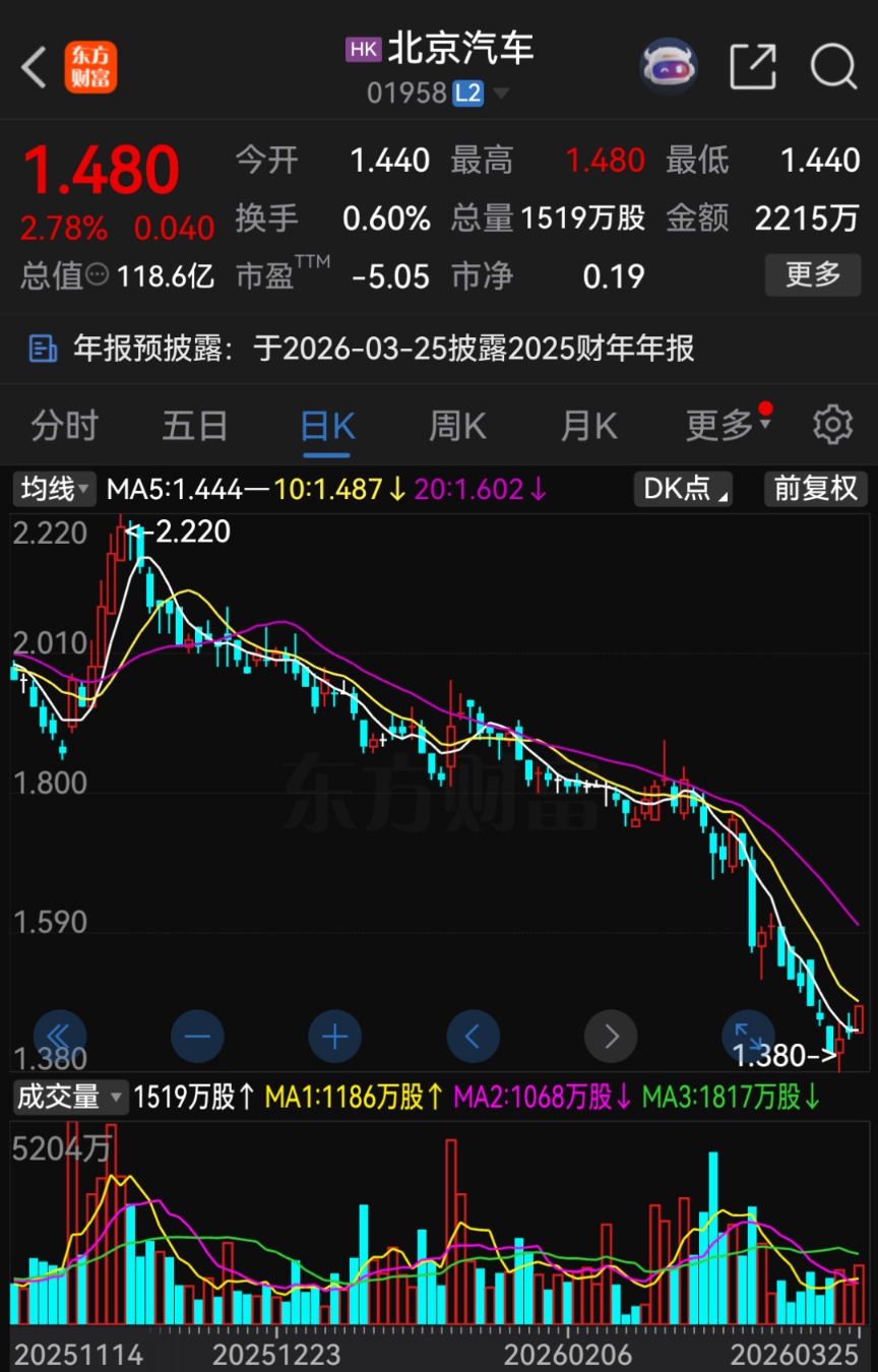 截至3月25日收盘,北汽蓝谷股价报7.21元/股,总市值为459.10亿元;北京汽车股价报1.48港元/股,总市值为118.60亿港元。