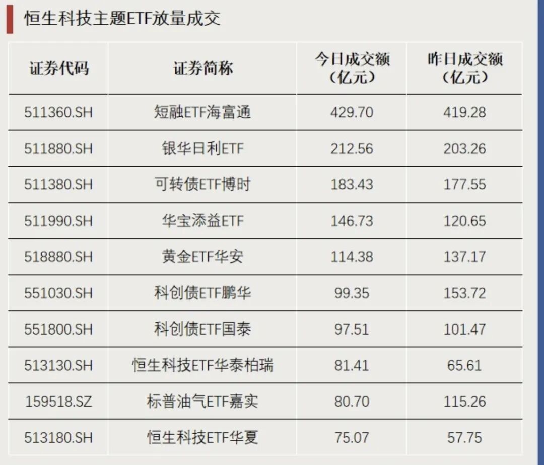 今天成交额最大的ETF是短融ETF海富通,成交额为429.7亿元。恒生科技主题ETF放量成交,以恒生科技ETF华夏为例,成交额较昨日增加超17亿元。