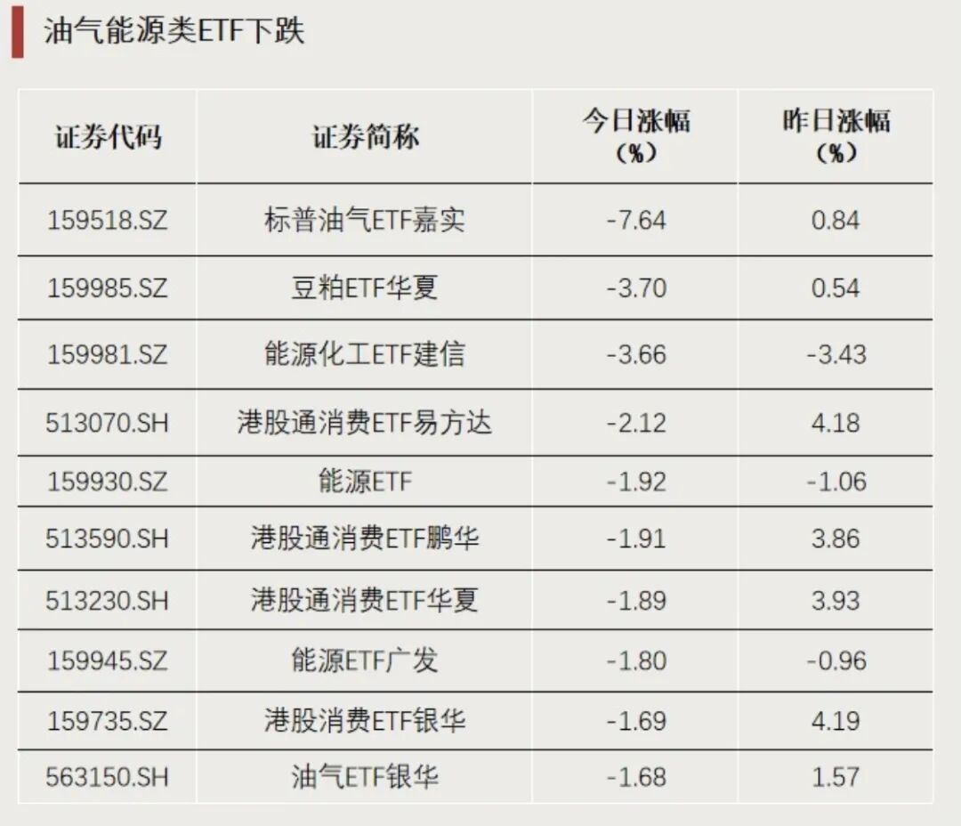 油气能源主题ETF今日调整明显。其中,标普油气ETF嘉实下跌7.64%,溢价率达7.71%。此外,能源化工ETF建信、能源ETF(159930)等均下跌。港股消费板块承压,多只港股通消费ETF收跌。