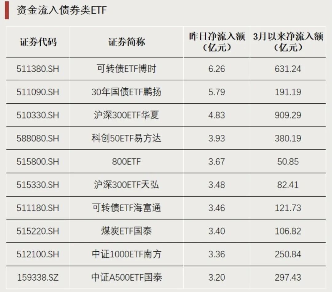 资金流向方面,3月24日,可转债ETF博时、30年国债ETF鹏扬、可转债ETF海富通等债券型ETF获资金净流入。