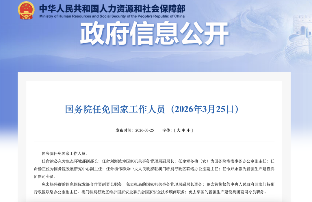 据人力资源和社会保障部网站3月25日消息,国务院任免国家工作人员: