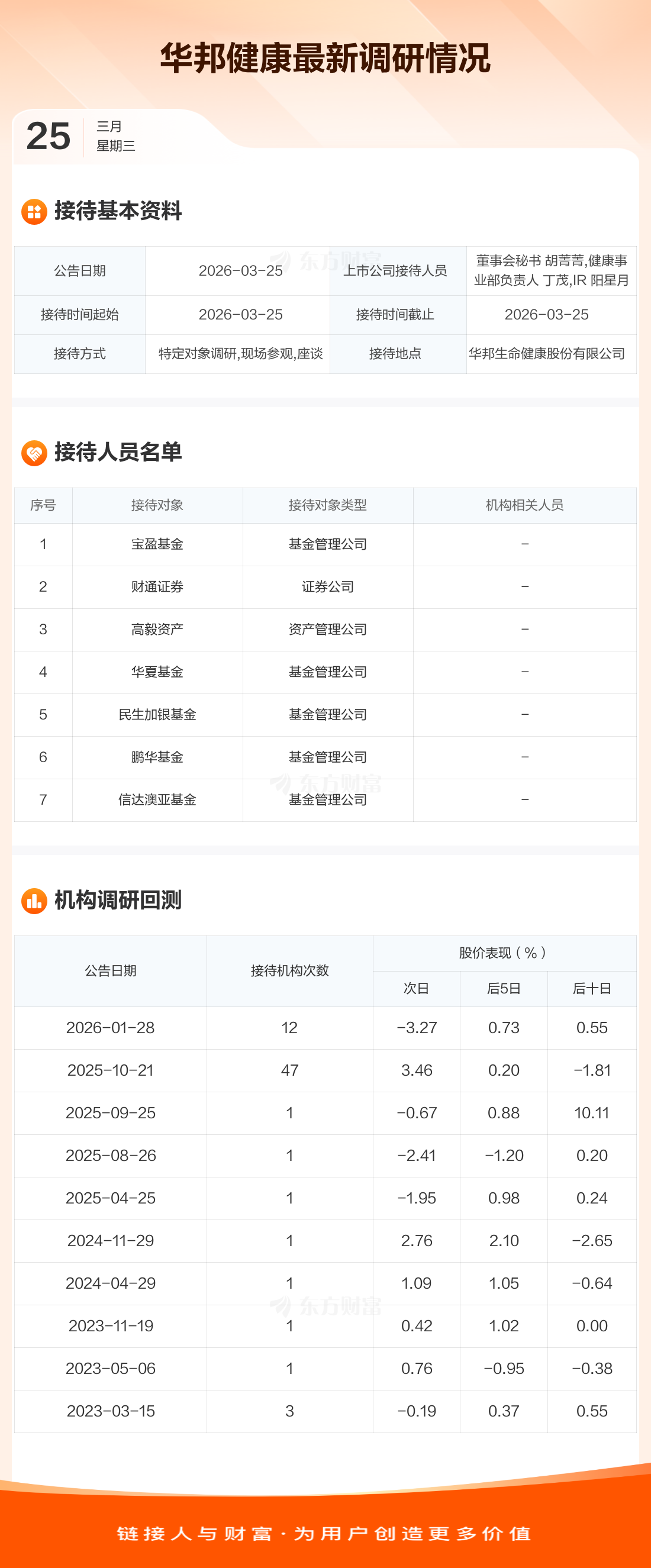 华邦健康3月25日公告称,3月25日接待宝盈基金等7家机构调研。接待人员包括董事会秘书 胡菁菁,健康事业部负责人 丁茂,IR 阳星月。