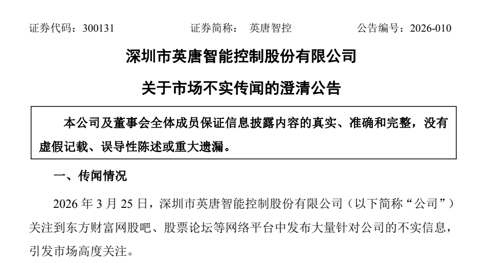 3月25日晚,英唐智控(300131)发布公告称,公司关注到网络平台中存在大量针对公司的不实信息,引发市场高度关注。