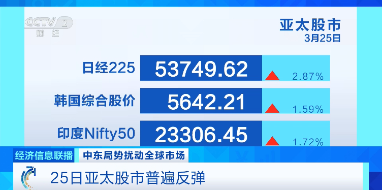 受乐观情绪推动,25日亚太股市普遍反弹。截至收盘,日本日经225指数上涨2.87%;韩国综合股价指数上涨1.59%;印度Nifty50指数上涨1.72%。