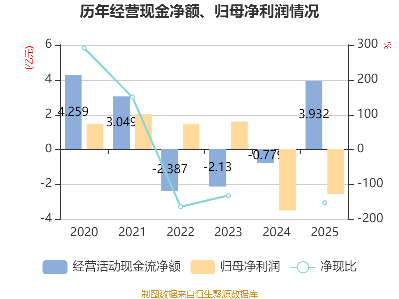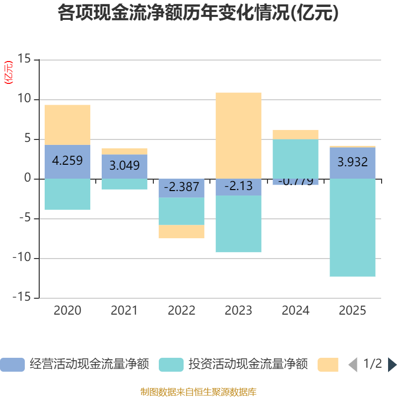 截至2025年,公司经营活动现金流净额为3.93亿元,同比增加4.71亿元;筹资活动现金流净额1922.83万元,同比减少9648.15万元;投资活动现金流净额-12.34亿元,上年同期为4.97亿元。
