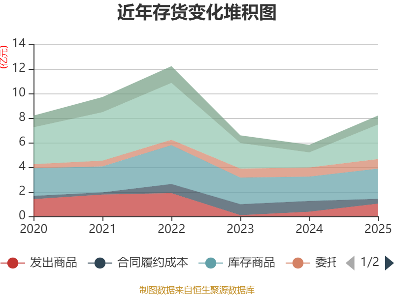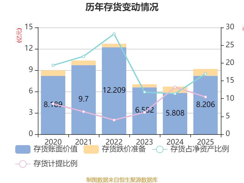 从存货变动来看,截至2025年末,公司存货账面价值为8.21亿元,占净资产的16.97%,较上年末增加2.4亿元。其中,存货跌价准备为9598.7万元,计提比例为10.47%。
