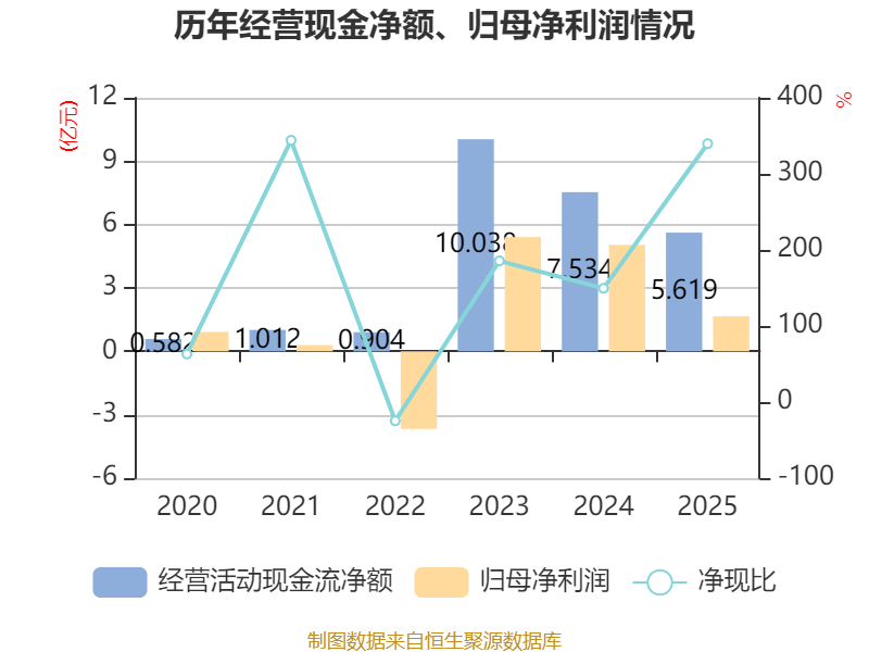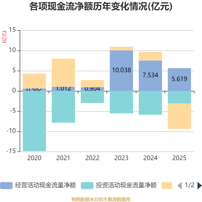 截至2025年,公司经营活动现金流净额为5.62亿元,同比下降25.41%;筹资活动现金流净额-6.3亿元,同比减少8.38亿元;投资活动现金流净额-3.11亿元,上年同期为-5.91亿元。