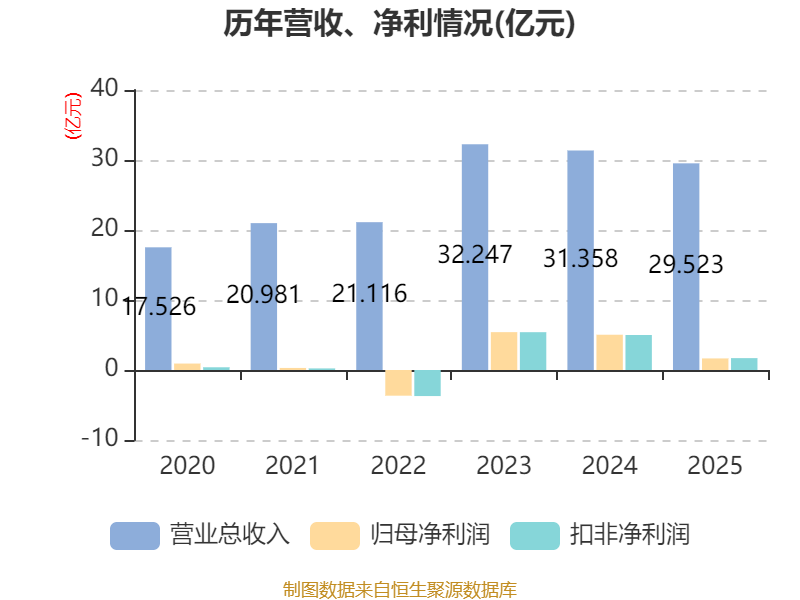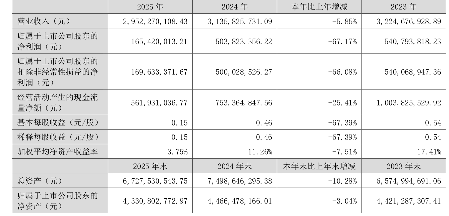 中证智能财讯益生股份(002458)3月26日披露2025年年度报告。2025年,公司实现营业总收入29.52亿元,同比下降5.85%;归母净利润1.65亿元,同比下降67.17%;扣非净利润1.7亿元,同比下降66.08%;经营活动产生的现金流量净额为5.62亿元,同比下降25.41%;报告期内,益生股份基本每股收益为0.15元,加权平均净资产收益率为3.75%。公司2025年度分配预案为:拟向全体股东每10股转3股。