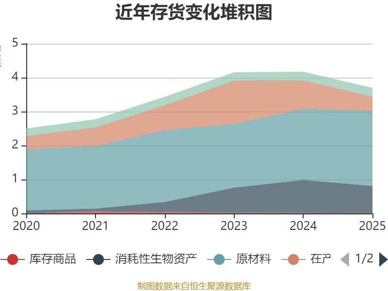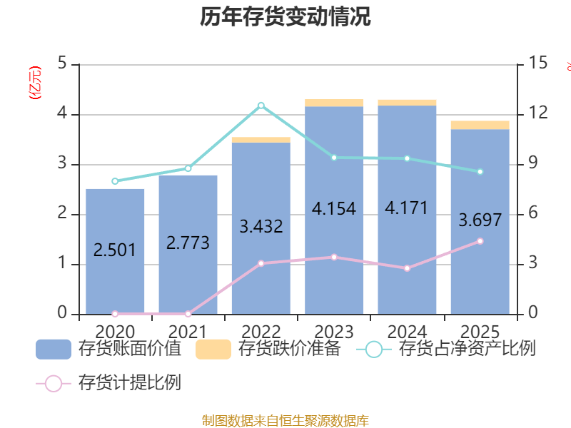 从存货变动来看,截至2025年末,公司存货账面价值为3.7亿元,占净资产的8.54%,较上年末减少4742.32万元。其中,存货跌价准备为1691.26万元,计提比例为4.37%。
