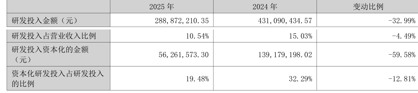 2025年全年,公司研发投入金额为2.89亿元,同比下降32.99%;研发投入占营业收入比例为10.54%,相比上年同期下降4.49个百分点。此外,公司全年研发投入资本化率为19.48%。