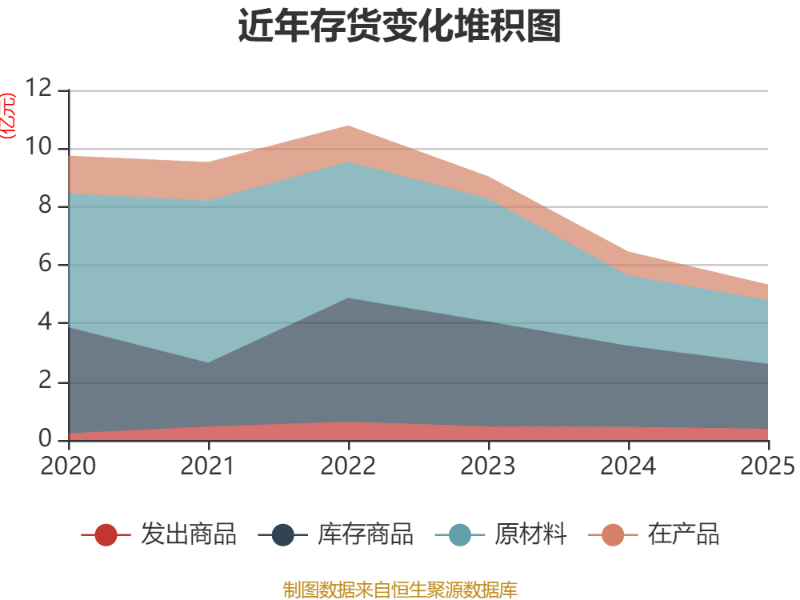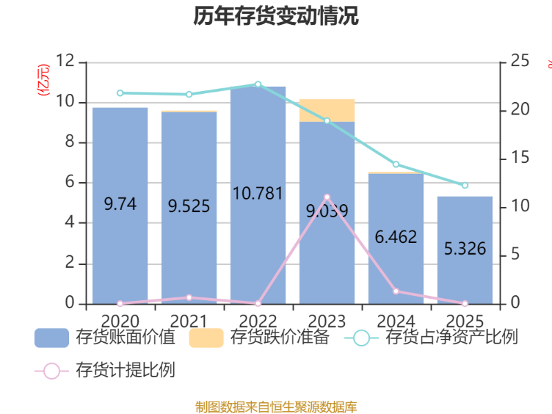 从存货变动来看,截至2025年末,公司存货账面价值为5.33亿元,占净资产的12.24%,较上年末减少1.14亿元。公司本期没有计提存货跌价准备。