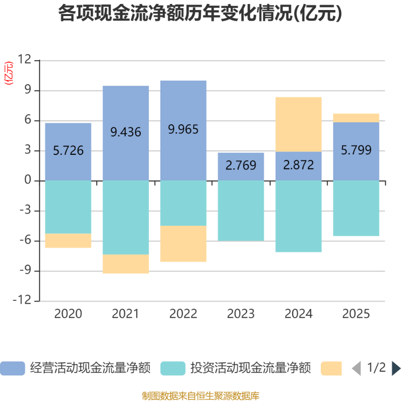 截至2025年,公司经营活动现金流净额为5.8亿元,同比增长101.93%;筹资活动现金流净额8632.07万元,同比减少4.57亿元;投资活动现金流净额-5.55亿元,上年同期为-7.15亿元。