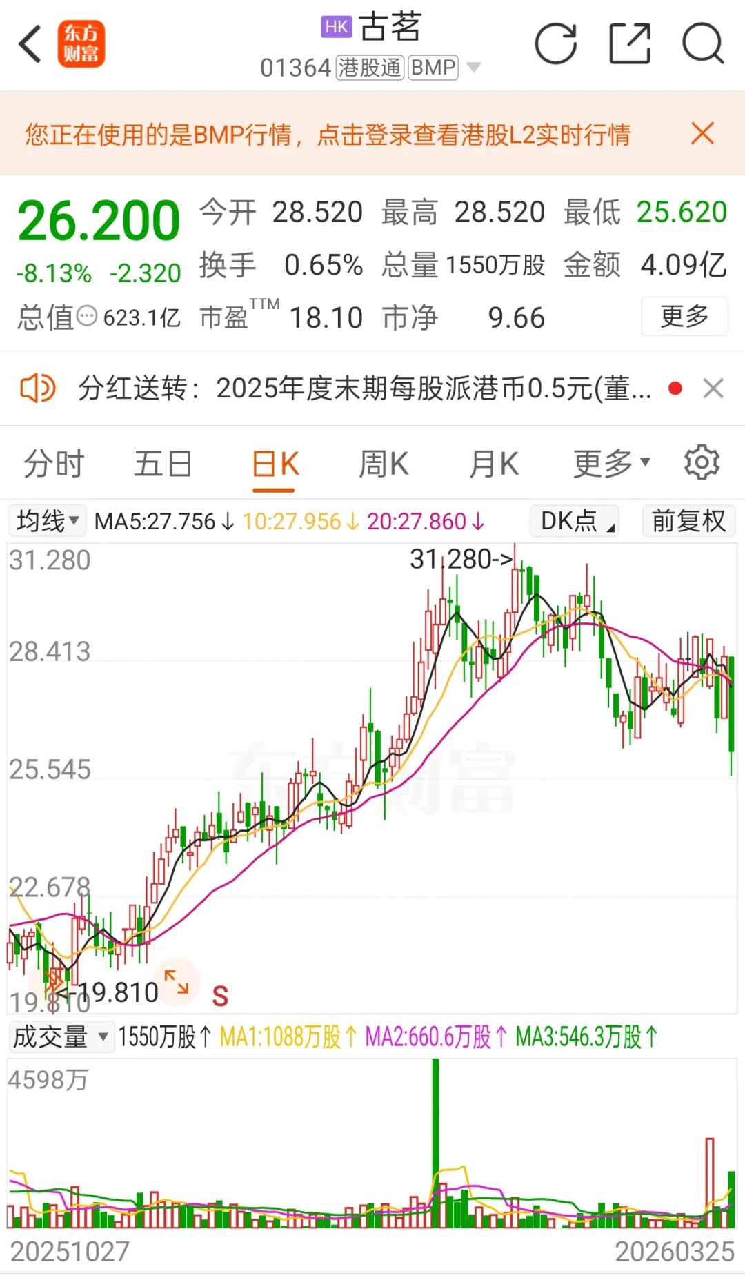 股价方面,3月25日,受港股消费板块集体调整影响,古茗下跌8.13%,报收于26.2港元/股,总市值为623亿港元。