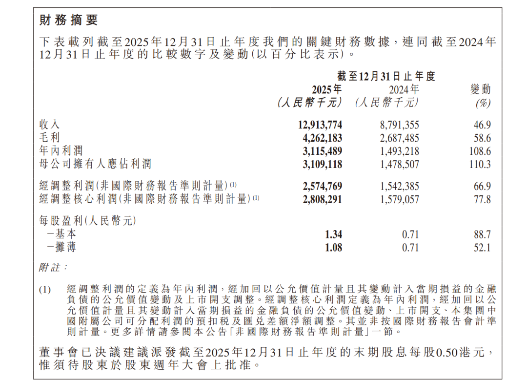 财报显示,2025年,古茗实现总收入129.14亿元,同比增长46.9%;归母净利润为31.09亿元,同比增长110.3%;经调整利润(非国际财务报告准则计量)为25.75亿元,同比增长66.9%。