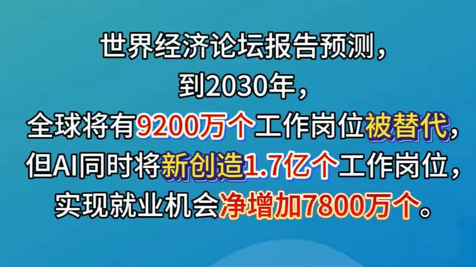 世界经济论坛报告预测,到2030年,全球将有9200万个工作岗位被替代,但人工智能同时将新创造1.7亿个工作岗位,实现就业机会净增加7800万个。