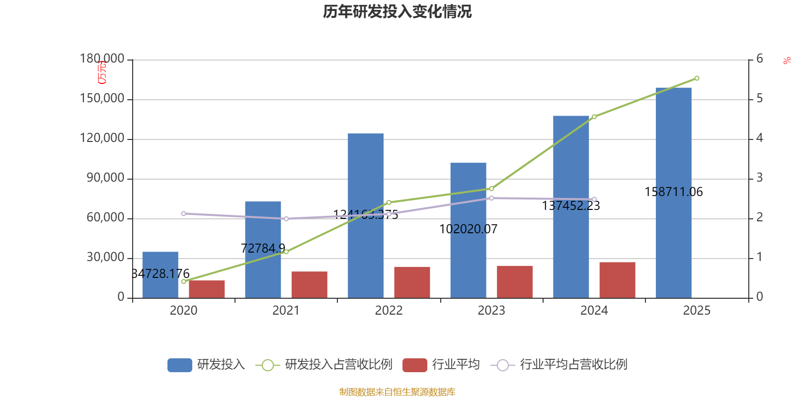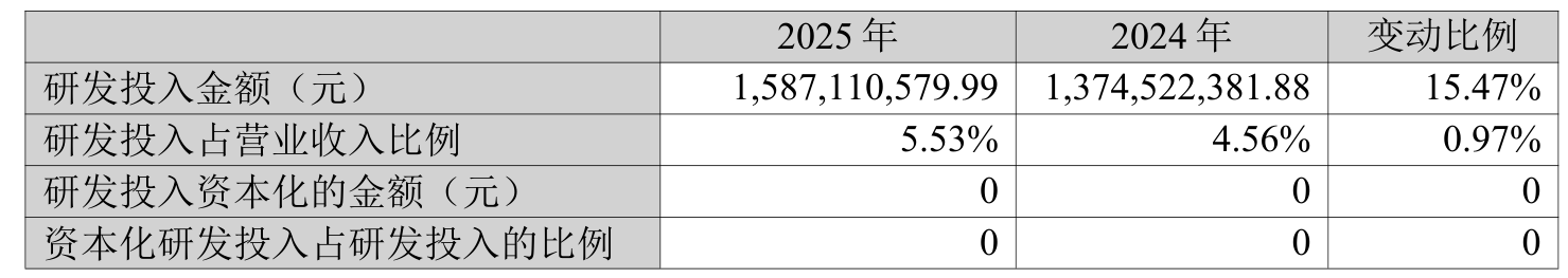 2025年全年,公司研发投入金额为15.87亿元,同比增长15.47%;研发投入占营业收入比例为5.53%,相比上年同期上升0.97个百分点。此外,公司全年研发投入资本化率为0%。