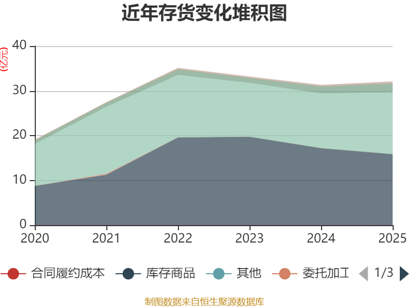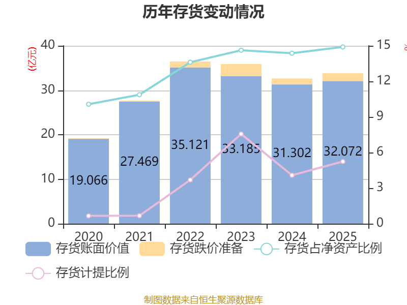 从存货变动来看,截至2025年末,公司存货账面价值为32.07亿元,占净资产的14.9%,较上年末增加7699.62万元。其中,存货跌价准备为1.78亿元,计提比例为5.24%。