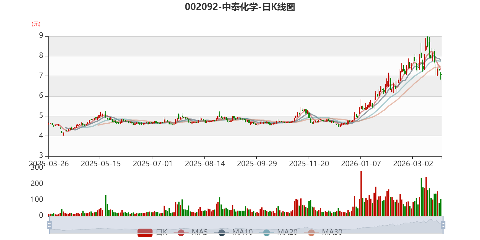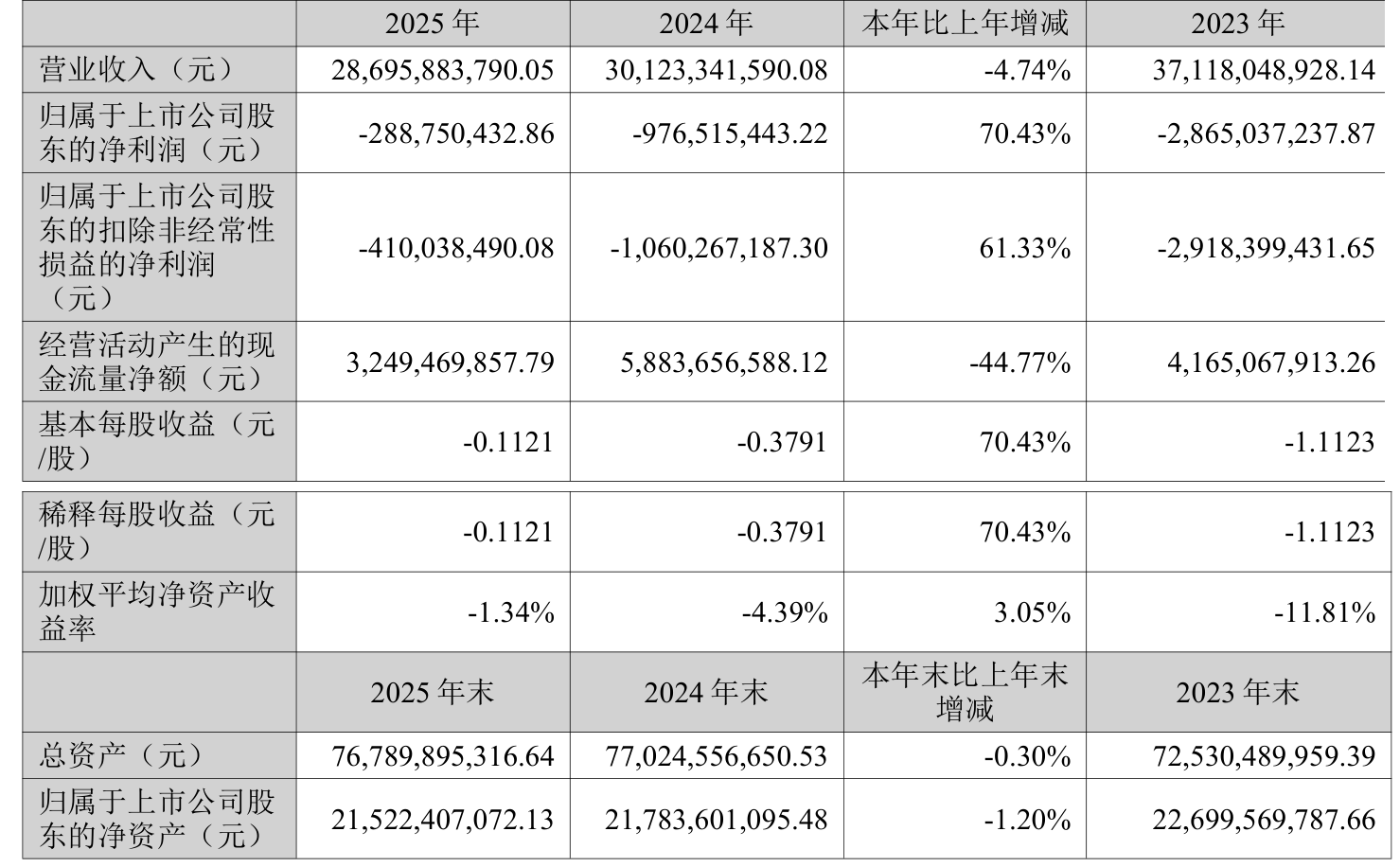 中证智能财讯中泰化学(002092)3月26日披露2025年年度报告。2025年,公司实现营业总收入286.96亿元,同比下降4.74%;归母净利润亏损2.89亿元,上年同期亏损9.77亿元;扣非净利润亏损4.1亿元,上年同期亏损10.6亿元;经营活动产生的现金流量净额为32.49亿元,同比下降44.77%;报告期内,中泰化学基本每股收益为-0.1121元,加权平均净资产收益率为-1.34%。