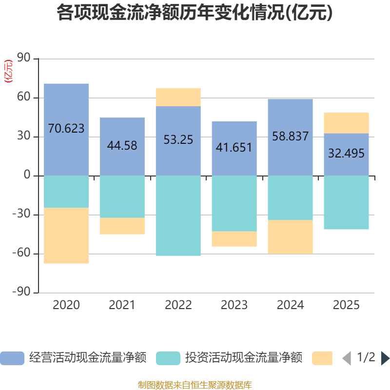 截至2025年,公司经营活动现金流净额为32.49亿元,同比下降44.77%;筹资活动现金流净额15.94亿元,同比增加41.8亿元;投资活动现金流净额-41.36亿元,上年同期为-34.39亿元。