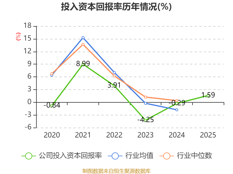 数据显示,2025年公司加权平均净资产收益率为-1.34%,较上年同期上升3.05个百分点。公司2025年投入资本回报率为1.59%,较上年同期上升1.88个百分点。