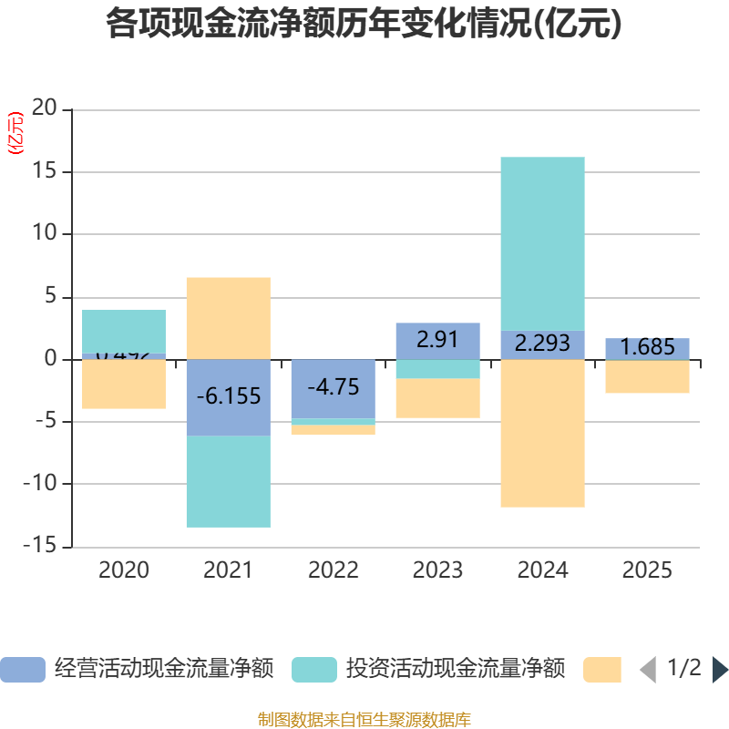 截至2025年,公司经营活动现金流净额为1.69亿元,同比下降26.5%;筹资活动现金流净额-2.62亿元,同比增加9.22亿元;投资活动现金流净额-833.74万元,上年同期为13.89亿元。