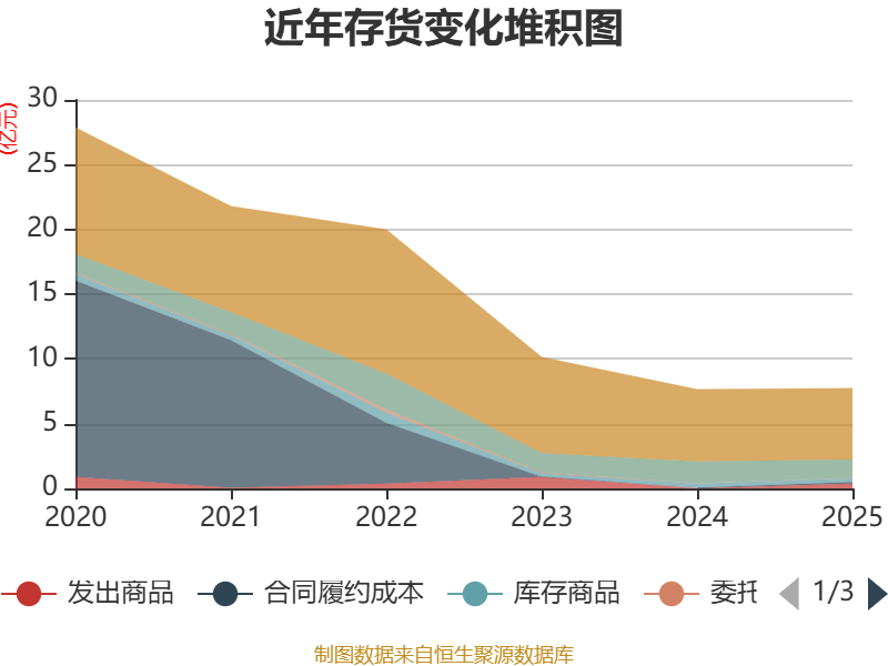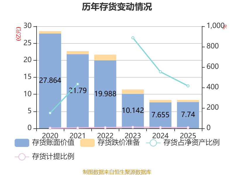 从存货变动来看,截至2025年末,公司存货账面价值为7.74亿元,占净资产的415.73%,较上年末增加850.38万元。其中,存货跌价准备为6169.82万元,计提比例为7.38%。