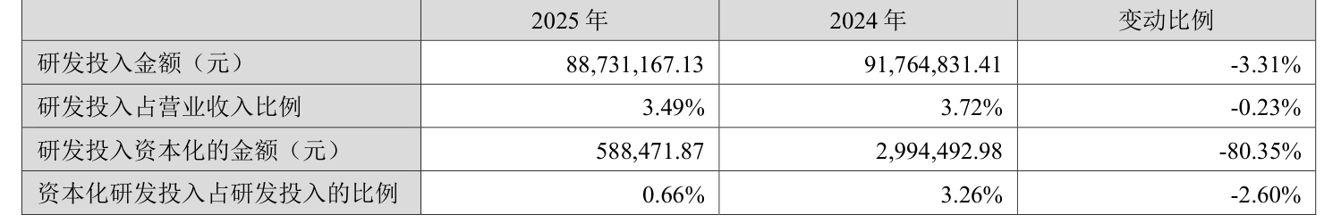 2025年全年,公司研发投入金额为8873.12万元,同比下降3.31%;研发投入占营业收入比例为3.49%,相比上年同期下降0.23个百分点。此外,公司全年研发投入资本化率为0.66%。