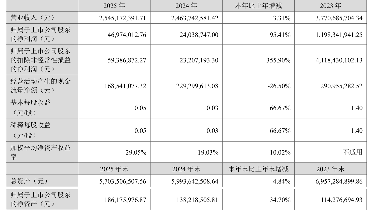 中证智能财讯天沃科技(002564)3月26日披露2025年年度报告。2025年,公司实现营业总收入25.45亿元,同比增长3.31%;归母净利润4697.4万元,同比增长95.41%;扣非净利润5938.69万元,同比扭亏;经营活动产生的现金流量净额为1.69亿元,同比下降26.50%;报告期内,天沃科技基本每股收益为0.05元,加权平均净资产收益率为29.05%。