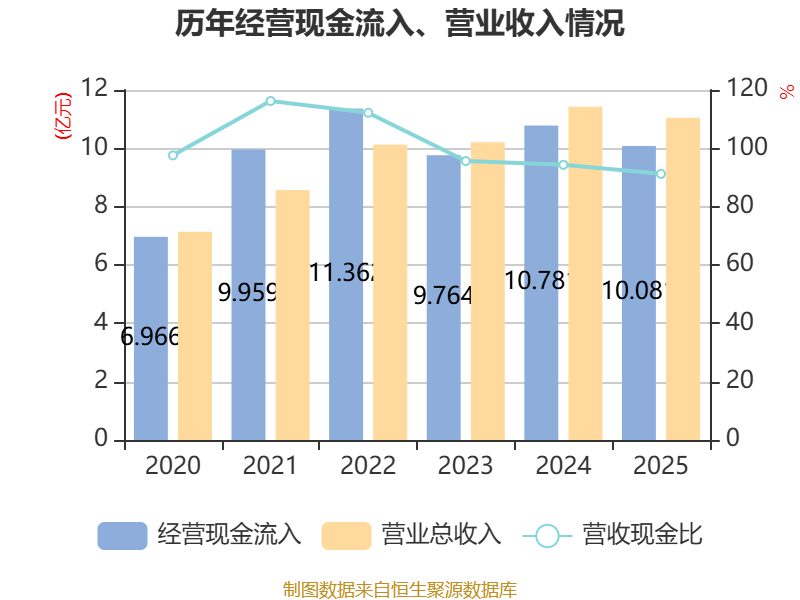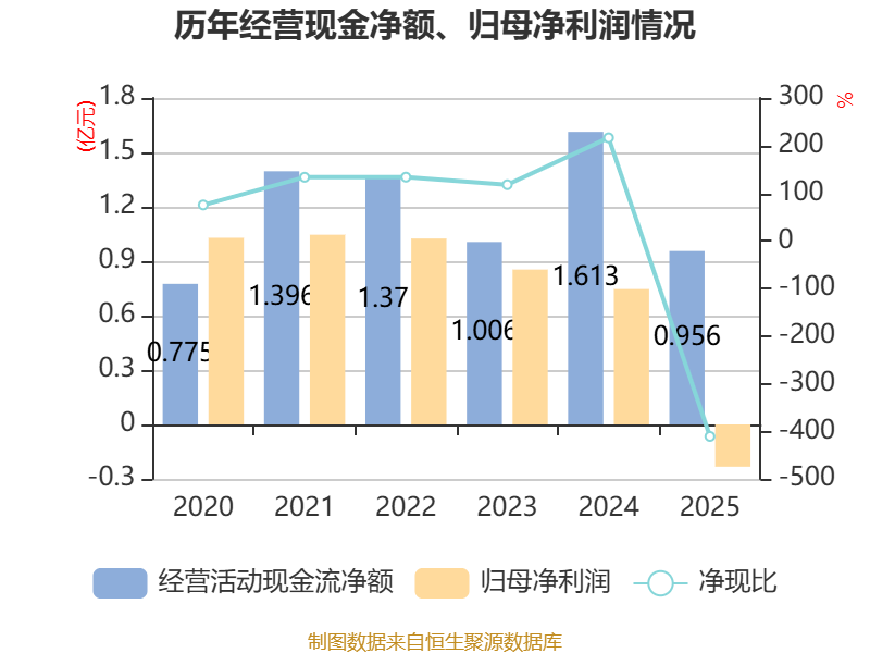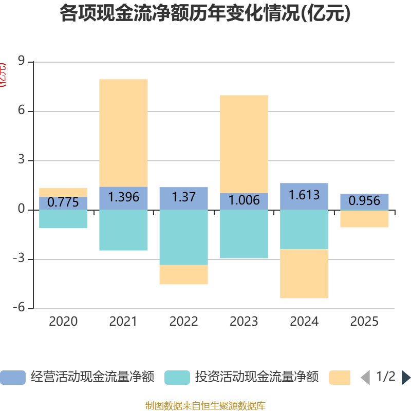 截至2025年,公司经营活动现金流净额为9558.65万元,同比下降40.74%;筹资活动现金流净额-1.02亿元,同比增加1.95亿元;投资活动现金流净额-578.91万元,上年同期为-2.42亿元。