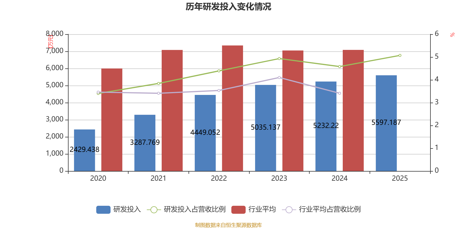 2025年全年,公司研发投入金额为5597.19万元,同比增长6.98%;研发投入占营业收入比例为5.07%,相比上年同期上升0.49个百分点。此外,公司全年研发投入资本化率为0%。