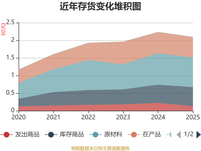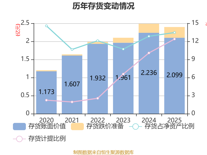 从存货变动来看,截至2025年末,公司存货账面价值为2.1亿元,占净资产的13.46%,较上年末减少1369.51万元。其中,存货跌价准备为2966.4万元,计提比例为12.38%。