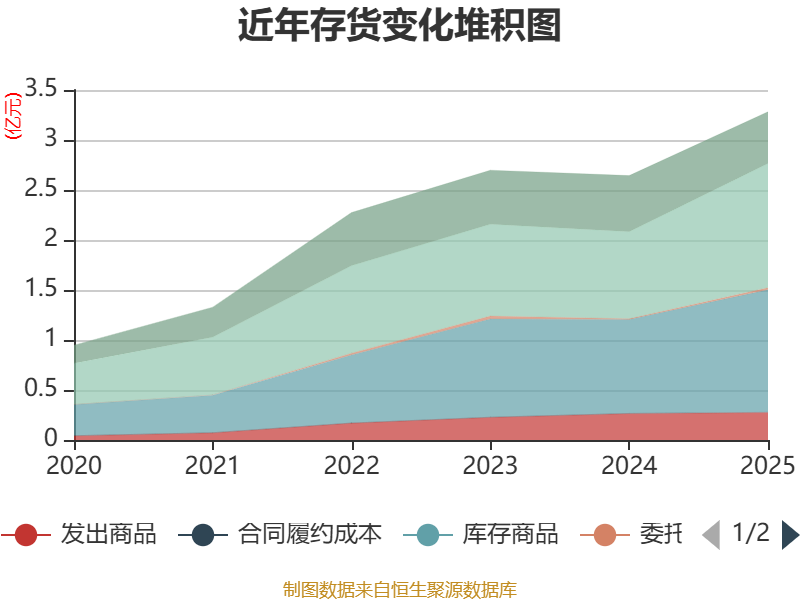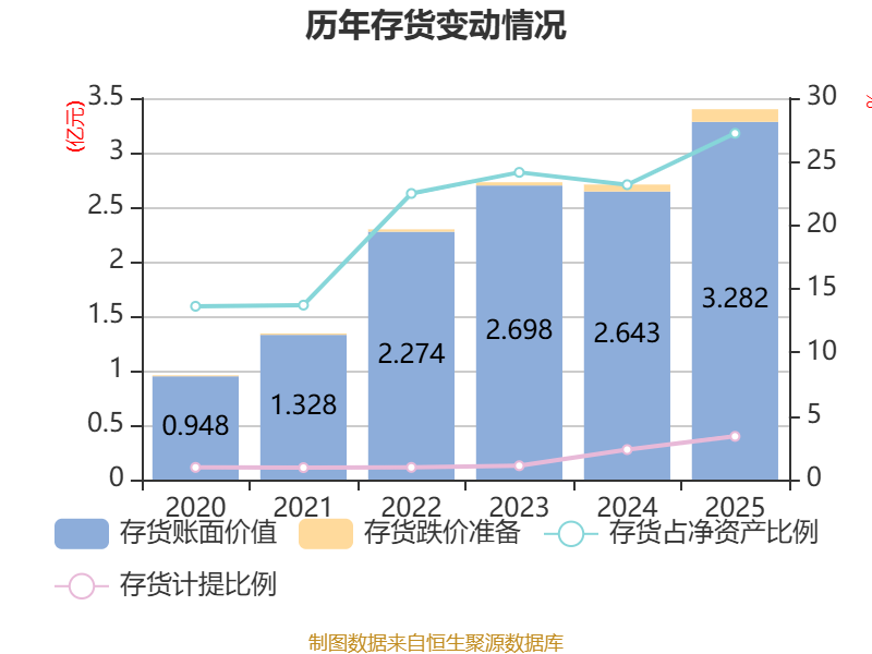 从存货变动来看,截至2025年末,公司存货账面价值为3.28亿元,占净资产的27.23%,较上年末增加6394.99万元。其中,存货跌价准备为1156.07万元,计提比例为3.4%。