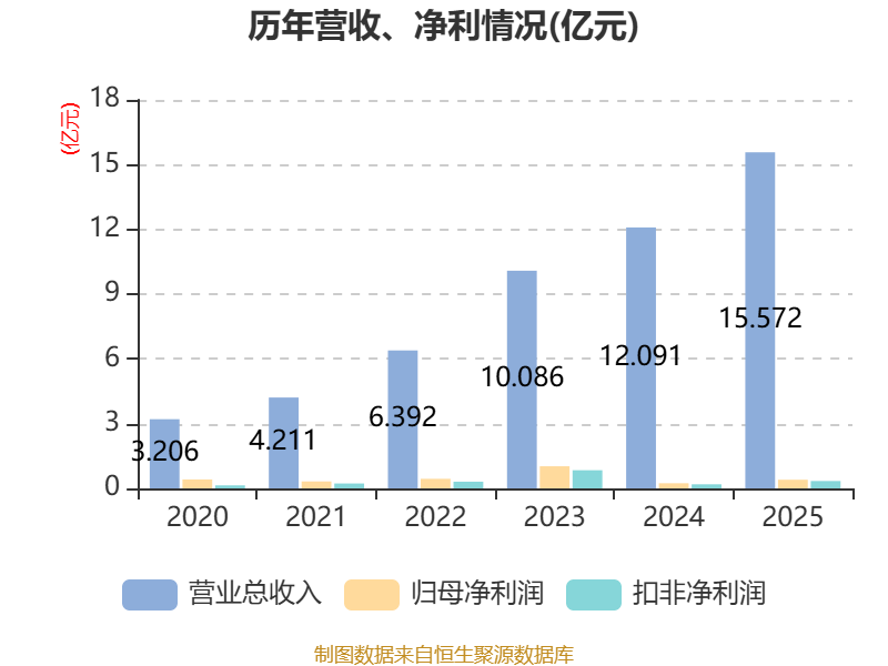 中证智能财讯通合科技(300491)3月26日披露2025年年度报告。2025年,公司实现营业总收入15.57亿元,同比增长28.78%;归母净利润4015.33万元,同比增长67.72%;扣非净利润3424.09万元,同比增长79.80%;经营活动产生的现金流量净额为7365.71万元,同比增长26.15%;报告期内,通合科技基本每股收益为0.23元,加权平均净资产收益率为3.42%。公司2025年度分配预案为:拟向全体股东每10股派现0.8元(含税)。