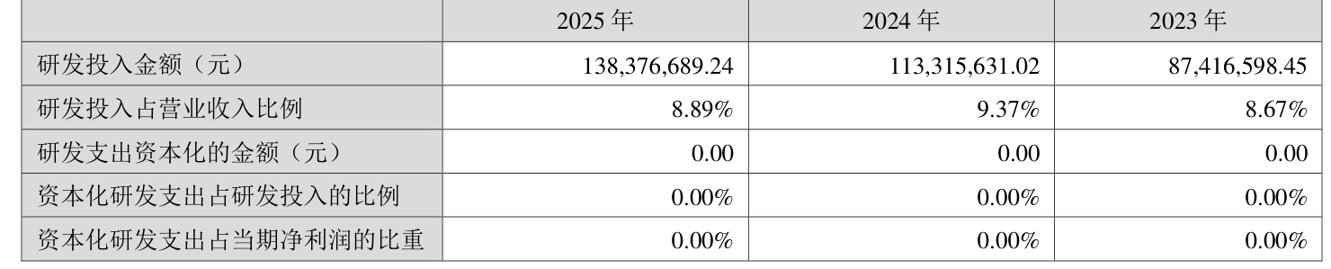 2025年全年,公司研发投入金额为1.38亿元,同比增长22.12%;研发投入占营业收入比例为8.89%,相比上年同期下降0.48个百分点。此外,公司全年研发投入资本化率为0%。