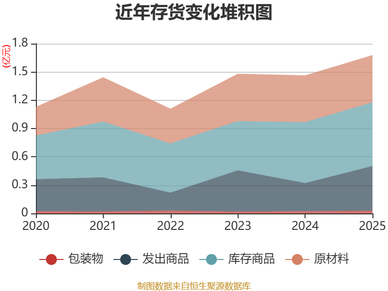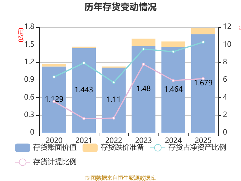 从存货变动来看,截至2025年末,公司存货账面价值为1.68亿元,占净资产的10.3%,较上年末增加2149.49万元。其中,存货跌价准备为1100.79万元,计提比例为6.15%。