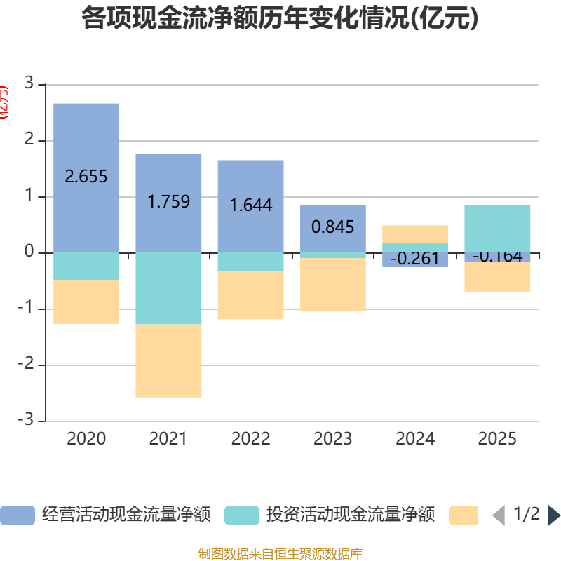 截至2025年,公司经营活动现金流净额为-1640.06万元,同比增加966.94万元;筹资活动现金流净额-5343.79万元,同比减少8451.74万元;投资活动现金流净额8473.46万元,上年同期为1712.61万元。