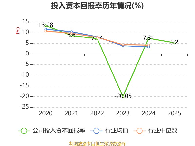 数据显示,2025年公司加权平均净资产收益率为6.49%,较上年同期下降2.29个百分点。公司2025年投入资本回报率为5.2%,较上年同期下降2.11个百分点。