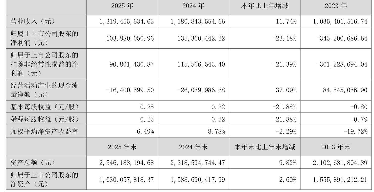 中证智能财讯高盟新材(300200)3月26日披露2025年年度报告。2025年,公司实现营业总收入13.19亿元,同比增长11.74%;归母净利润1.04亿元,同比下降23.18%;扣非净利润9080.14万元,同比下降21.39%;经营活动产生的现金流量净额为-1640.06万元,上年同期为-2607万元;报告期内,高盟新材基本每股收益为0.25元,加权平均净资产收益率为6.49%。公司2025年度分配预案为:拟向全体股东每10股派现1.5元(含税)。