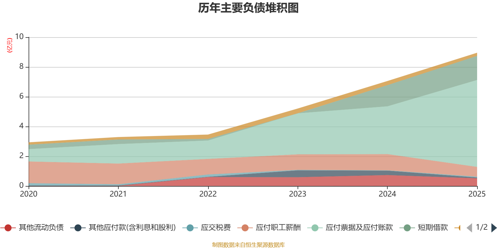 负债重大变化方面,截至2025年末,公司应付票据及应付账款较上年末增加82.01%,占公司总资产比重上升9.1个百分点;应付职工薪酬较上年末减少40.06%,占公司总资产比重下降2.14个百分点;其他流动负债较上年末减少29.67%,占公司总资产比重下降1.14个百分点;其他应付款(含利息和股利)较上年末减少82.78%,占公司总资产比重下降1.08个百分点。