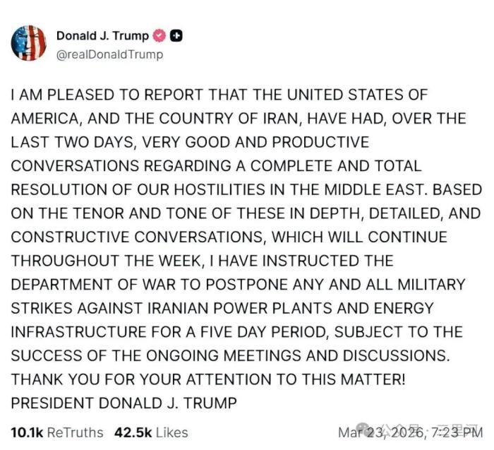 他“很高兴”地通报,美国和伊朗在过去两天里进行了“非常良好且富有成效的对话”,他已指示战争部将军事打击“推迟5天”。