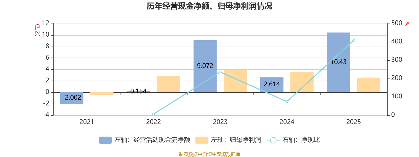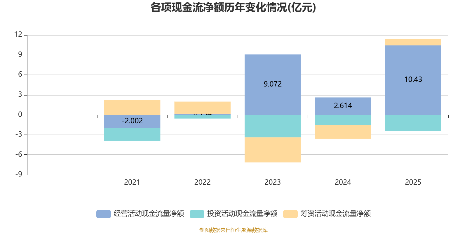 2025年,公司经营活动现金流净额为10.43亿元,同比增长299.04%;筹资活动现金流净额9823.8万元,同比增加3.02亿元;投资活动现金流净额-2.45亿元,上年同期为-1.54亿元。