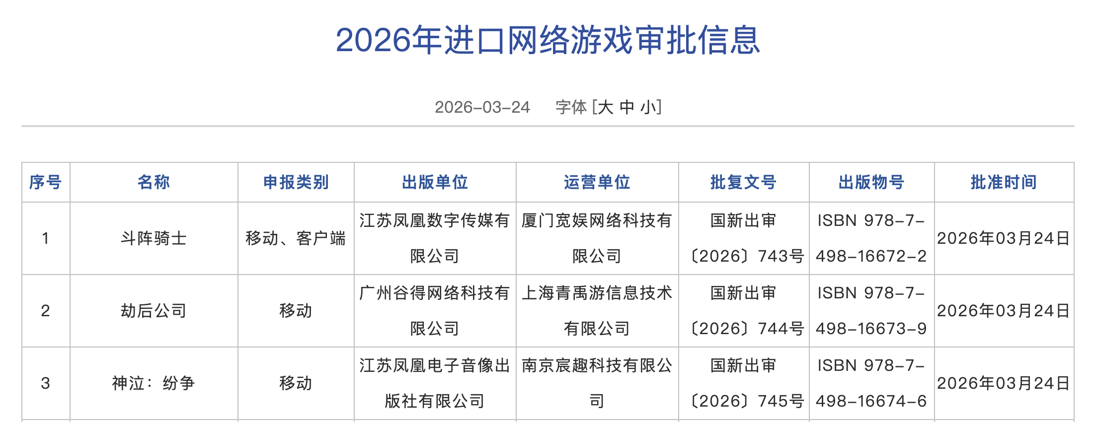 国家新闻出版署公布2026年3月份进口网络游戏审批信息,共3款游戏获批。