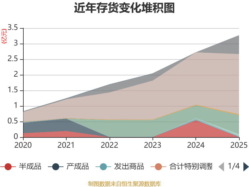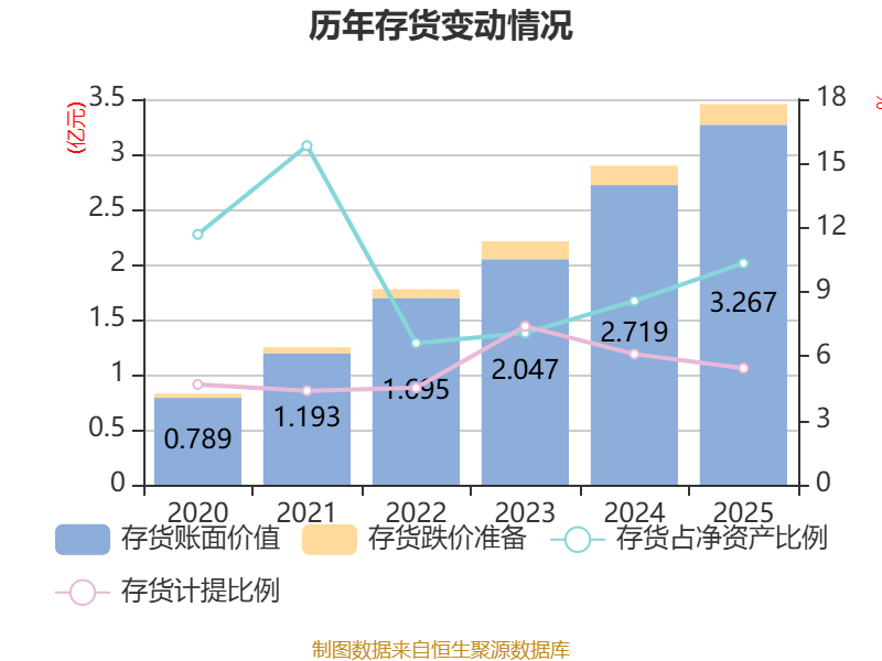 从存货变动来看,截至2025年末,公司存货账面价值为3.27亿元,占净资产的10.34%,较上年末增加5486.03万元。其中,存货跌价准备为1878.68万元,计提比例为5.44%。