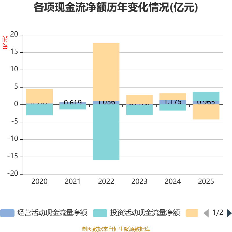 截至2025年,公司经营活动现金流净额为9646.8万元,同比下降17.87%;筹资活动现金流净额-4.32亿元,同比减少6.33亿元;投资活动现金流净额2.68亿元,上年同期为-1.77亿元。