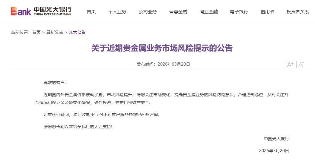 光大银行发布《关于近期贵金属业务市场风险提示的公告》称,请关注市场变化,提高贵金属业务的风险防范意识,合理控制仓位,及时关注持仓情况和保证金余额变化情况,理性投资,守护自身财产安全。