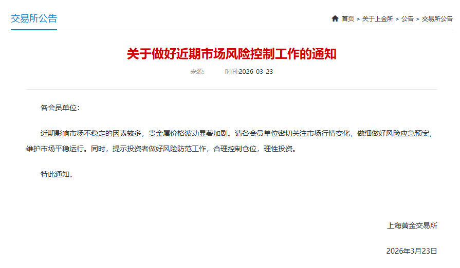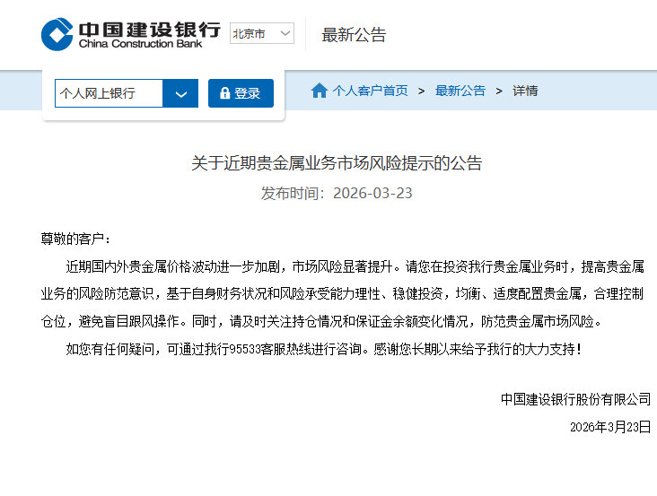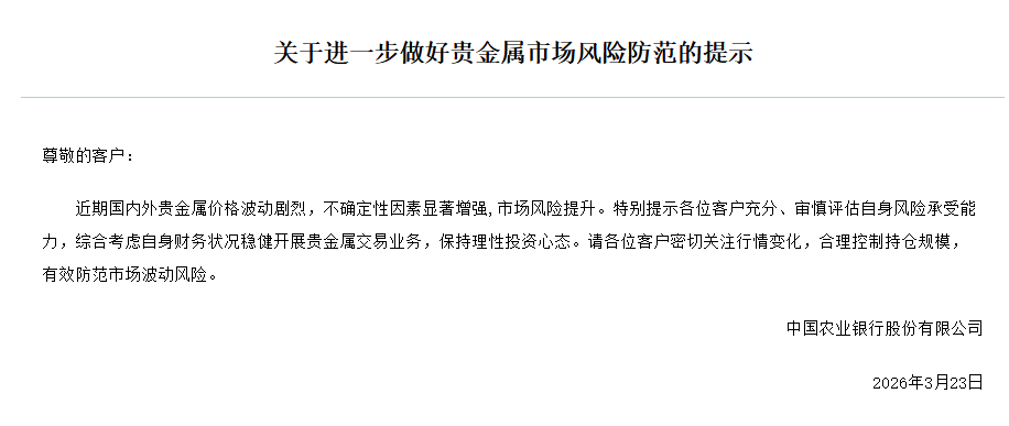 同日(3月23日),农业银行发布《关于进一步做好贵金属市场风险防范的提示》称,特别提示各位客户充分、审慎评估自身风险承受能力,综合考虑自身财务状况稳健开展贵金属交易业务,保持理性投资心态。请各位客户密切关注行情变化,合理控制持仓规模,有效防范市场波动风险。