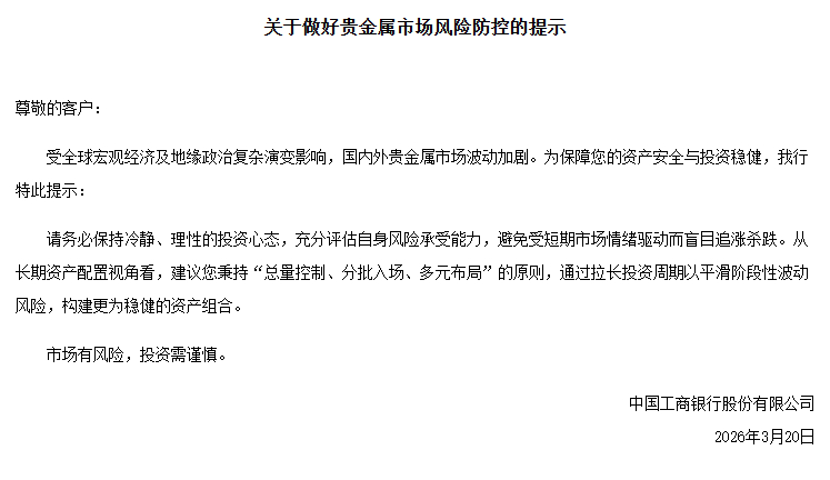 3月20日,工商银行发布《关于做好贵金属市场风险防控的提示》称,为保障资产安全与投资稳健,特此提示:请务必保持冷静、理性的投资心态,充分评估自身风险承受能力,避免受短期市场情绪驱动而盲目追涨杀跌。从长期资产配置视角看,建议秉持“总量控制、分批入场、多元布局”的原则,通过拉长投资周期以平滑阶段性波动风险,构建更为稳健的资产组合。